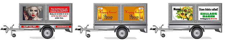 Våra vagnar med reklam syns överallt i trafiken. Vill du hänga på med en egen design hjälper vi dig gärna.